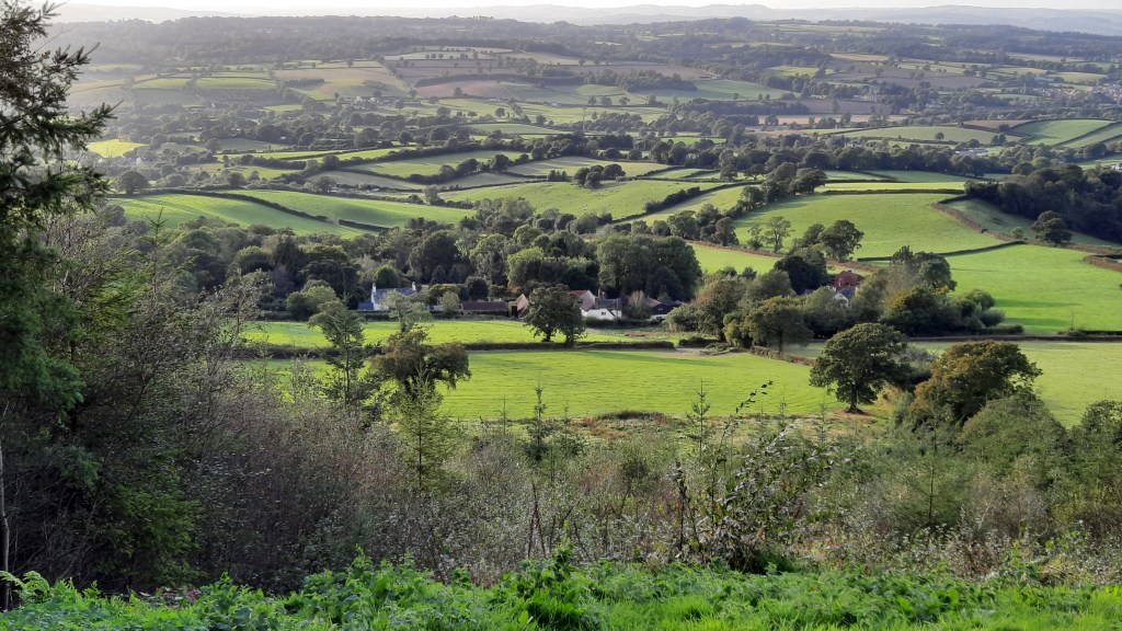 On our return to Sidmouth, we drove the couple of miles up the hill which is situated behind our bungalow. Fire Beacon Hill is reputed to be one of the sites chosen during Tudor times, by which by lighting beacons on a chain of hill tops, a warning could be quickly signalled from Plymouth to London that the Spanish Armada had been sighted. From the top of the hill there are some wonderful views.