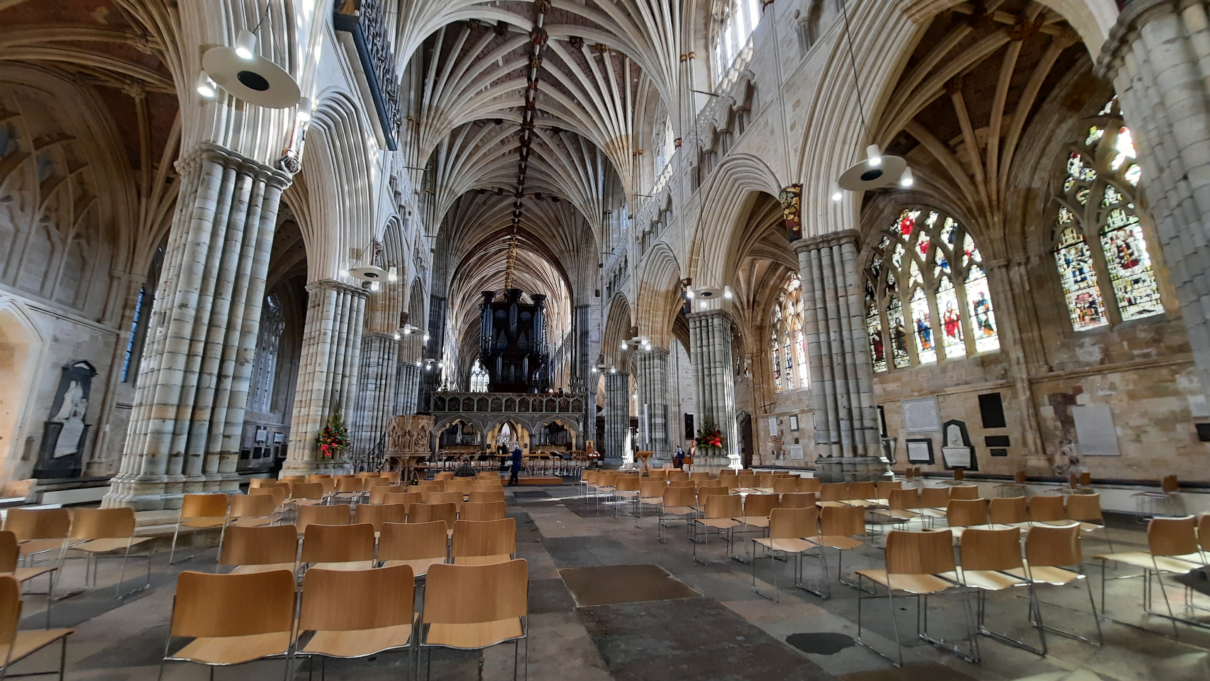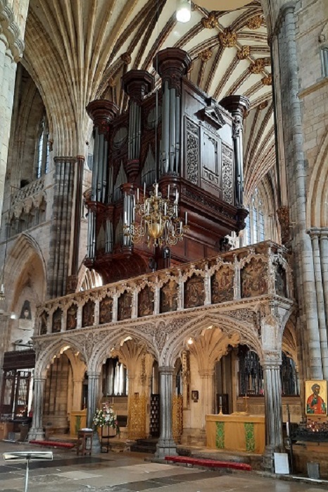 After ten minutes I’d reached the precincts of the Cathedral. I donned my mask and went in. High up in the roof vaulting is a boss bearing the coat of arms of John de Grandisson who was bishop of Exeter in the 1300’s so we may assume that the Cathedral was nearing completion by that time.