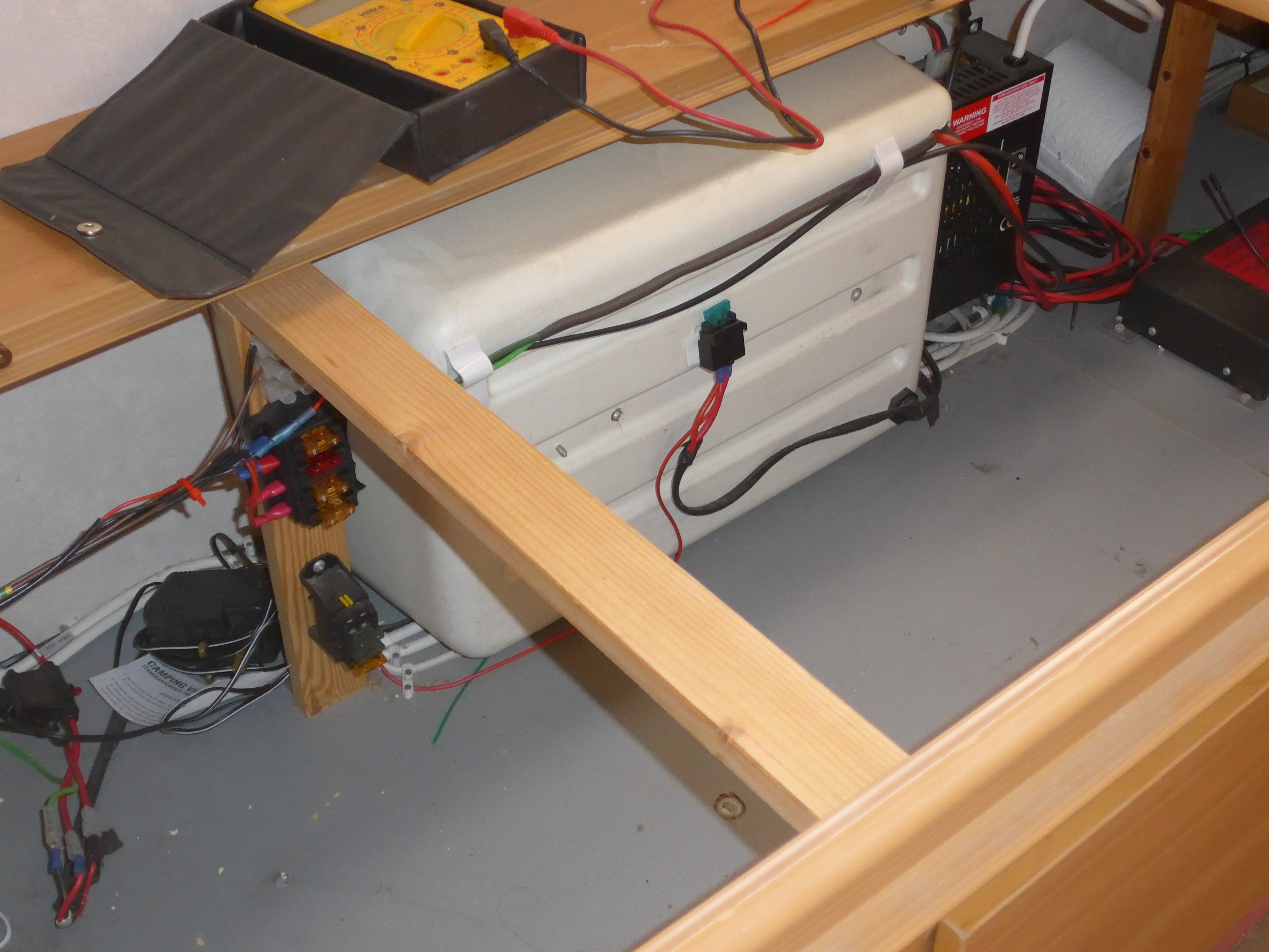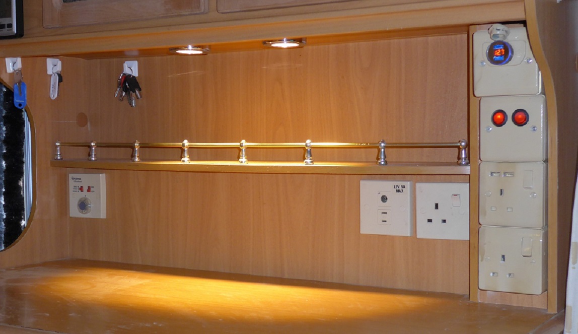 There wasn’t a lighting circuit on the nearside of the van so I decided to put in new wiring direct from the caravan battery. I connected a negative and positive from the two battery terminals and then into the under-seat locker where they connected to a four fuse block.