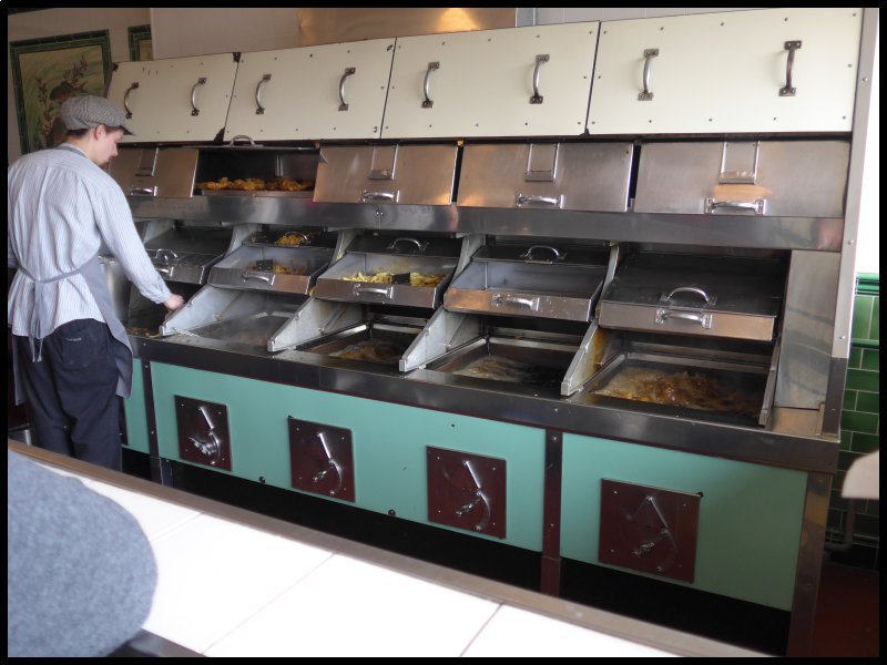 A working 1930’s fish & chip shop was doing a roaring trade with queues of visiting school children.