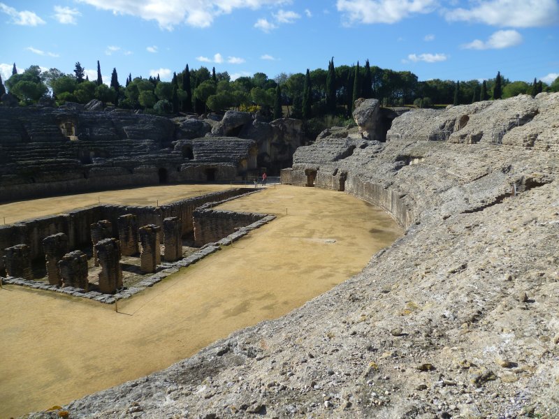 I was ready to leave by 9am and headed north towards Salamanca for a couple of miles before joining the motor way and turning south. Traffic was extremely light and the motorway surface was excellent. Unfortunately no rest areas are provided. At one point I left the motorway to try and find a stopping area but all I did was travel for 5 miles on a parallel N-road before rejoining the motorway. By mid-day I’d reached the northern outskirts of Seville and when I saw the signs of Atalica I turned off and headed towards Santiponce. I recognized the area from last year and found the housing estate that was abandoned at the start of the financial crash. The roads with their parking bays were completed but no houses were ever built. Now it provides an ideal spot to park when visiting the Roman Excavation at Atalica. There was ample room to park the car and caravan for a lunch stop. After lunch I took a quick walk around the arena.