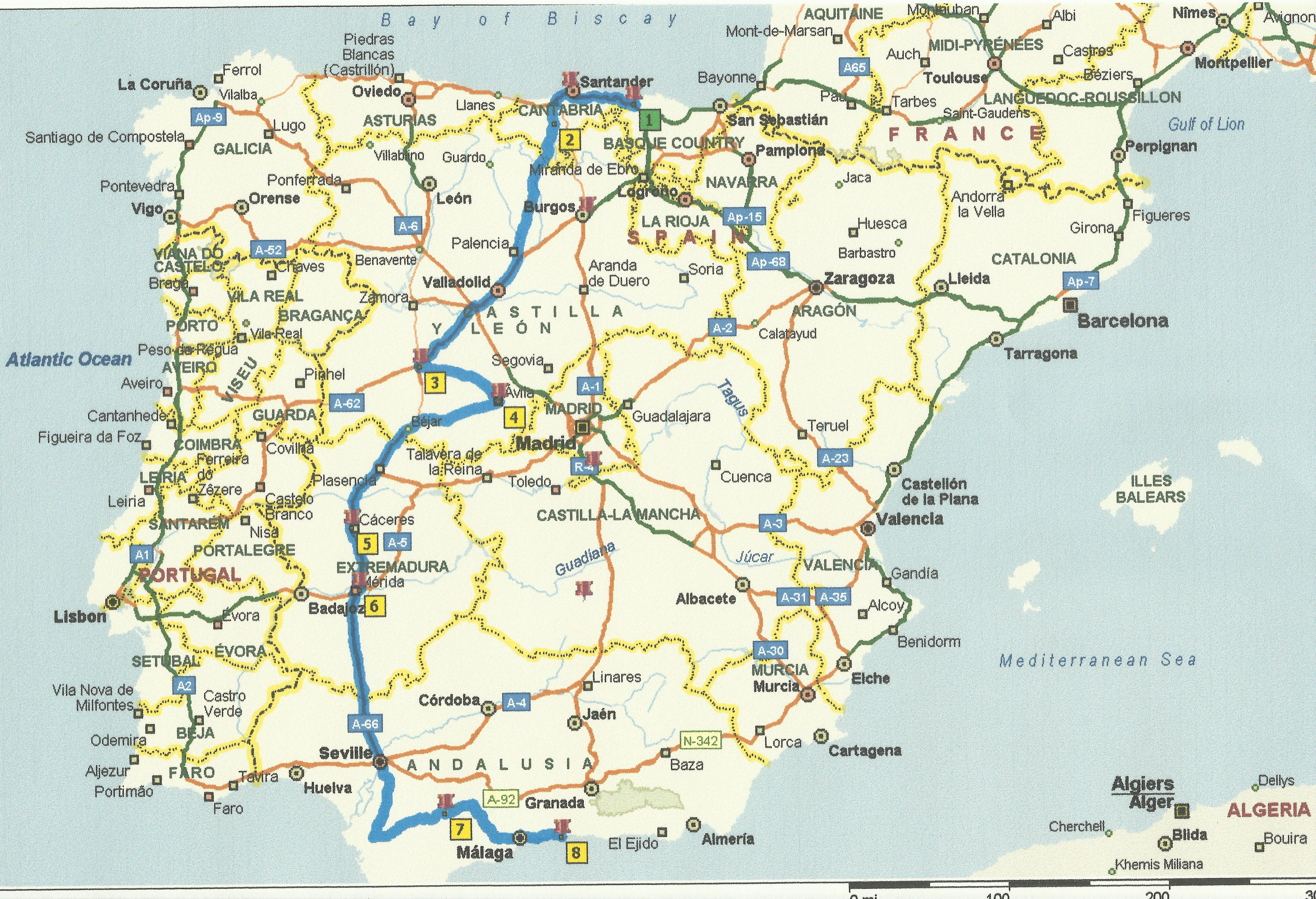 When I leave Bilbao I’ll be turning west along the coast road towards Santander, then heading inland on the A67 Autovia. This route gives me twenty miles extra driving but it avoids a 100 miles of toll-motorway. The plan is to make my first stop 300 miles away at Salamanca where I’ll probably stay for a couple of days. Other stops will be at Caceres, Merida and Olvera. Of course, route plans are subject to change. Last year my plan was to stop at Riaza before heading to Segovia, but the weather in northern Spain was so appalling that I carried on driving south; not stopping until Aranjuez, where I found the weather much better. My sight-seeing trip will be spread over about twelve days with an expected arrival in Torrox on the 14th.