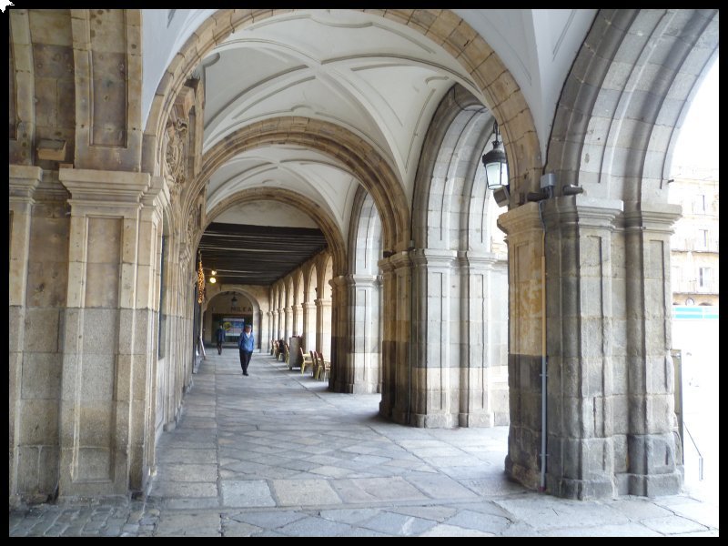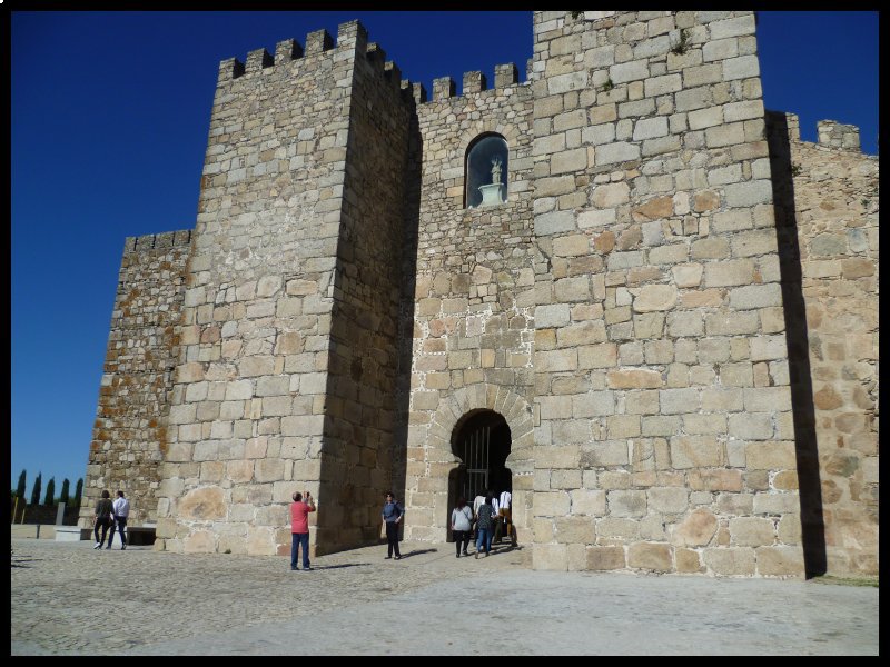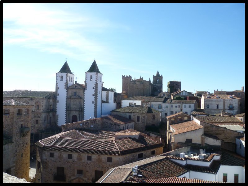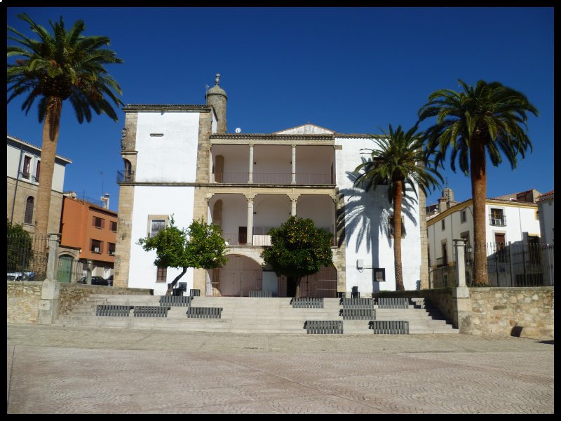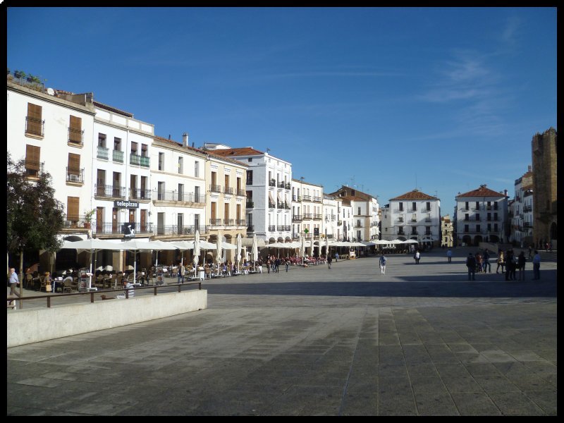 I stepped outside this morning to find a cloudless sky and the sun just coming up. It looked as though it was going to be a beautiful day. I set off early on the short drive into Caceres. My AutoRoute showed a carpark quite close to the walled city. I noted the coordinates, programmed them into my Tomtom and it took me to the entrance to a multi-story carpark. Not quite what I expected however, I took a ticket and found space on the second floor. I made my way to the street level and followed everyone else who seemed to know where they were going. A series of narrow streets and steps brought me to Plaza Major, a huge rectangular square lined on three sides with porticoed pavements and on the fourth by the city walls.