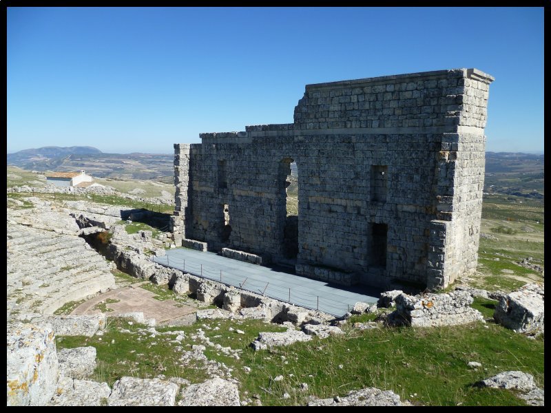 I programmed the Tomtom with the coordinates for Acinipo and discovered it was 12 miles away. Before long I’d turned off the Seville highway and took a road which twisted and turned up into the mountains for another ten miles. Eventually I arrived at a small car park occupied by three other cars, two of which had taken the only shade. I approached the entrance booth and, with the guy pointing and saying “English?”, he handed me a page of notes. In this remote spot more than 3250 feet high on a limestone plateau was once a thriving Roman town. It was of sufficient size and importance that it was able to mint its own currency. Today there is not much still standing.