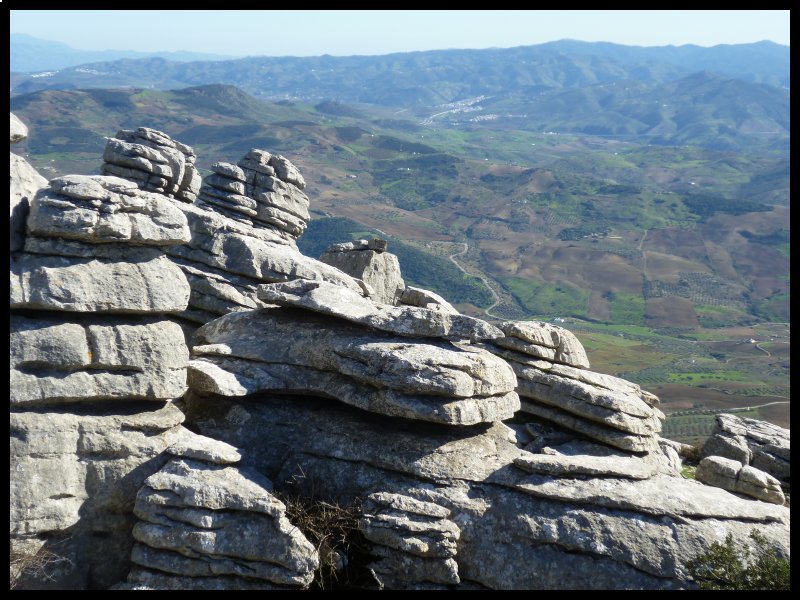 Since it was close to my journey back to El Pino I did a slight detour so that I could visit El Torcal, the nature reserve which is famous for its unusual limestone rock formations. Several millions of years ago the area was under the sea. Earthquakes forced the rock upwards into hills and mountains. The limestone still kept its layered formation and because of this, over millions of years the rain and wind have worn away at these layers to form incredible shapes. Two circular tours, one taking about an hour, the other rather longer, have been marked out around the reserve. I satisfied myself with a stroll to the viewing platform.