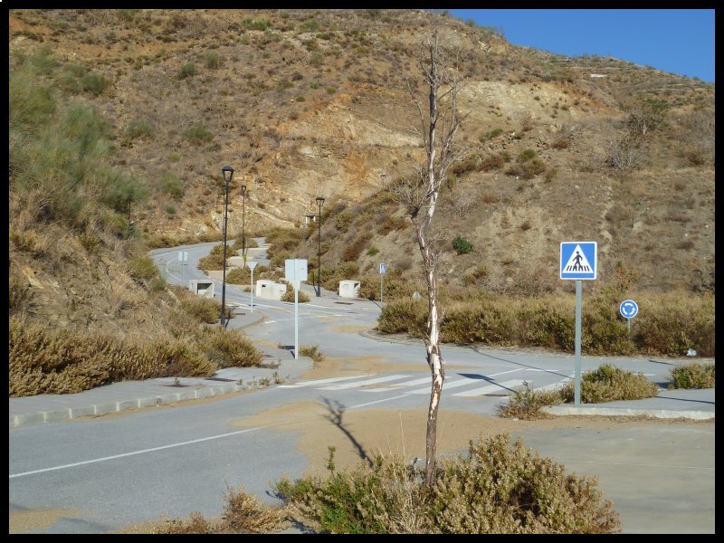 There are roundabouts, parking bays and even pedestrian crossings. And that’s it. The roads suddenly ends and the dirt roads take over. Eight or nine years ago the plan was to build a new urbanización, but instead, the financial crash came so not a house was built. Now we have a mile or so of concrete road with wildly overgrown verges and long-dead orange trees. The beautifully stone clad electric supply cabins have been vandalized for their equipment and thick copper cabling. The millions of Euros that must have been put into this project is mind-boggling. And throughout Spain, there are thousands of such like abandoned projects.