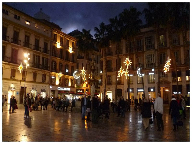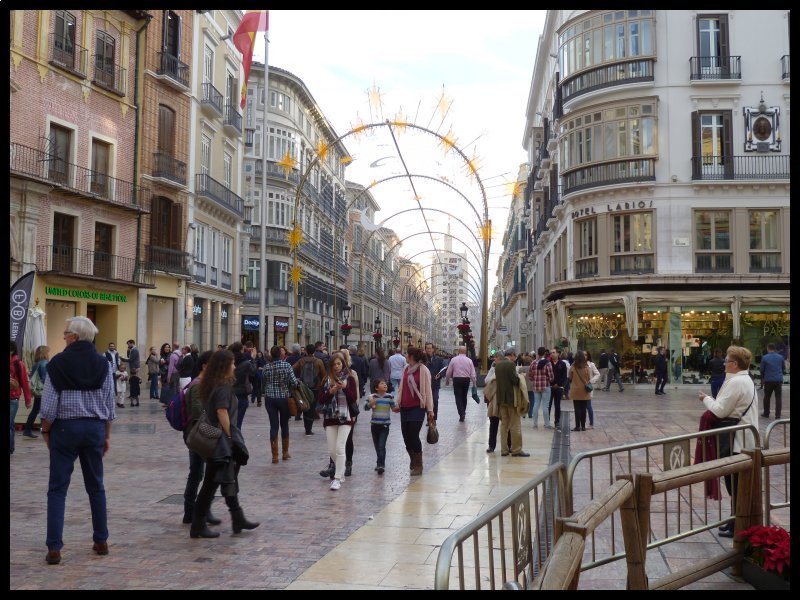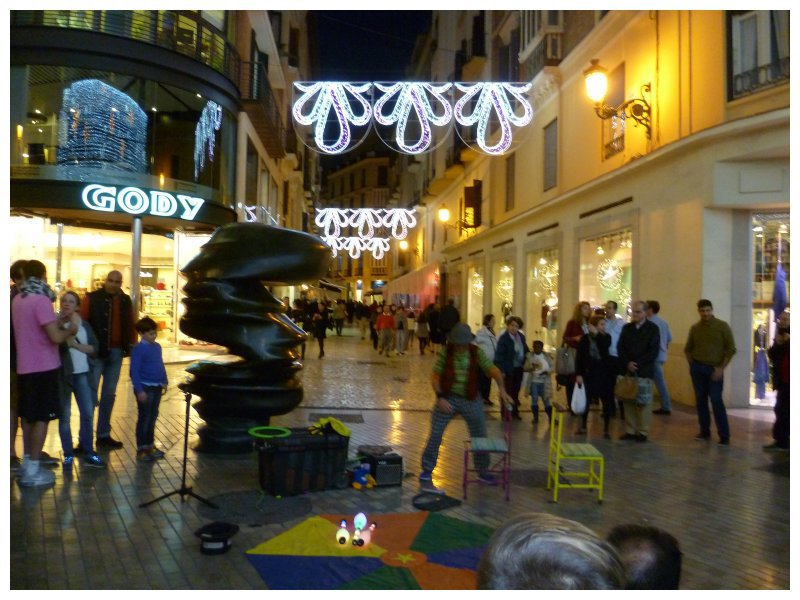 And so yesterday I decided to drive the 40 miles to Malaga to see what I’ve been missing for many years. Parking is a nightmare in the city so I drove to a shopping precinct close to the airport and took the train into the city. I arrived whilst it was still light and headed for one of the main shopping streets, the pedestrianized Calle Larios. I took the first pictures at about 5.15pm.