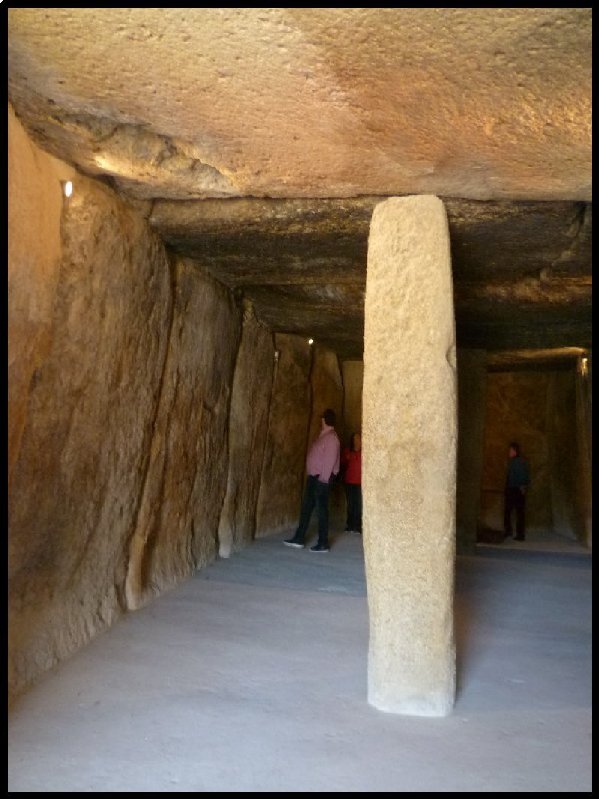 The purpose of my visit to Antequera was to see The Dolmen de Menga which is a megalithic burial mound which dates from the 3rd Century BC. It is considered to be the largest in Europe. It measures twenty-five metres long, five metres wide and four metres high. It was built using thirty-two huge squared stones, some of which have been calculated as weighing 180 tonnes. The chamber served as a burial place, probably by the ruling families, and once the structure was completed, the stones were covered by earth and built up into a hill.