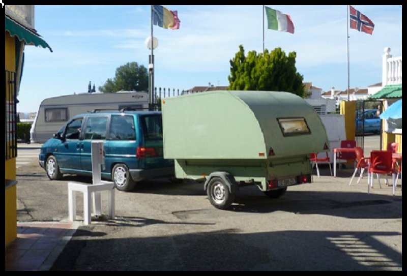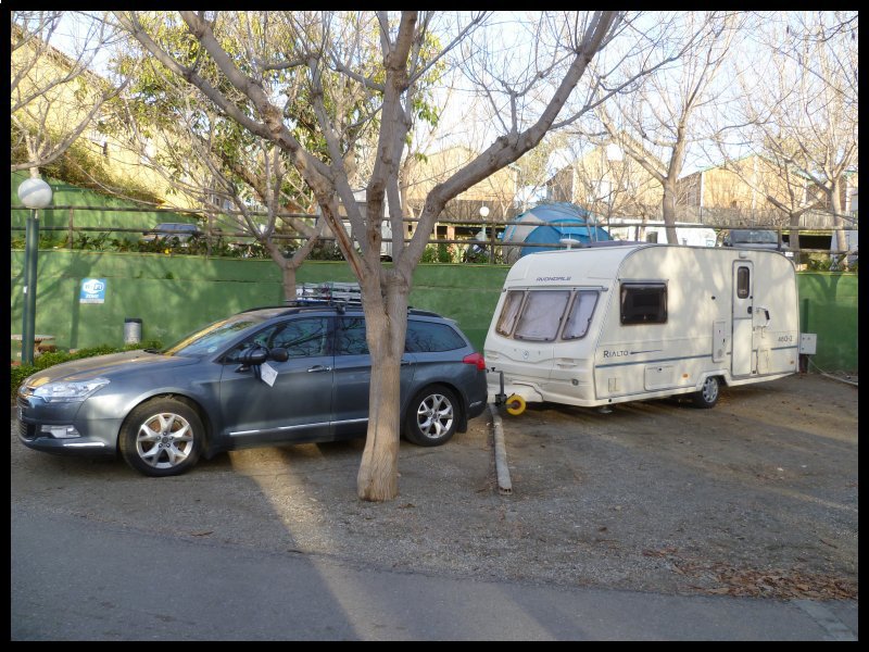 I was greeted by Sylvia in reception with the comment, “Hello John – maybe people will now stop asking me when you are due to arrive.” El Pino have a policy of not accepting bookings for pitches however, caravanners who have stayed there for a few times get a little bit of ‘pull’ with the management, so for me, an email to the site in September ensures that my favourite pitch is kept for me. The plastic tape around the trees is the give away that I’m on my way. After booking in and paying the first month’s site fees, I went back to the car and brought the outfit on to the site. Without a mover, it would be impossible to get the caravan into the position I like it.