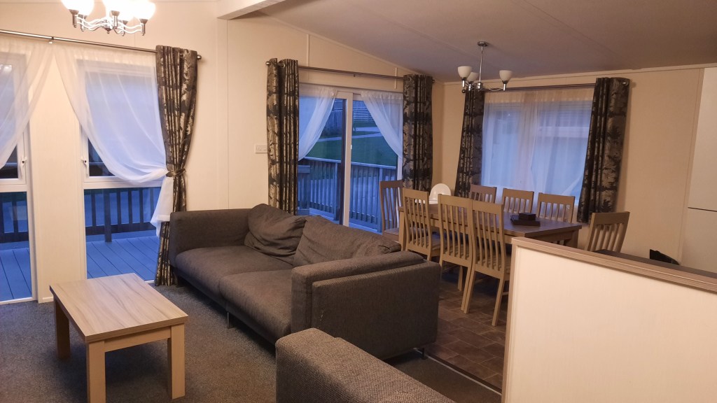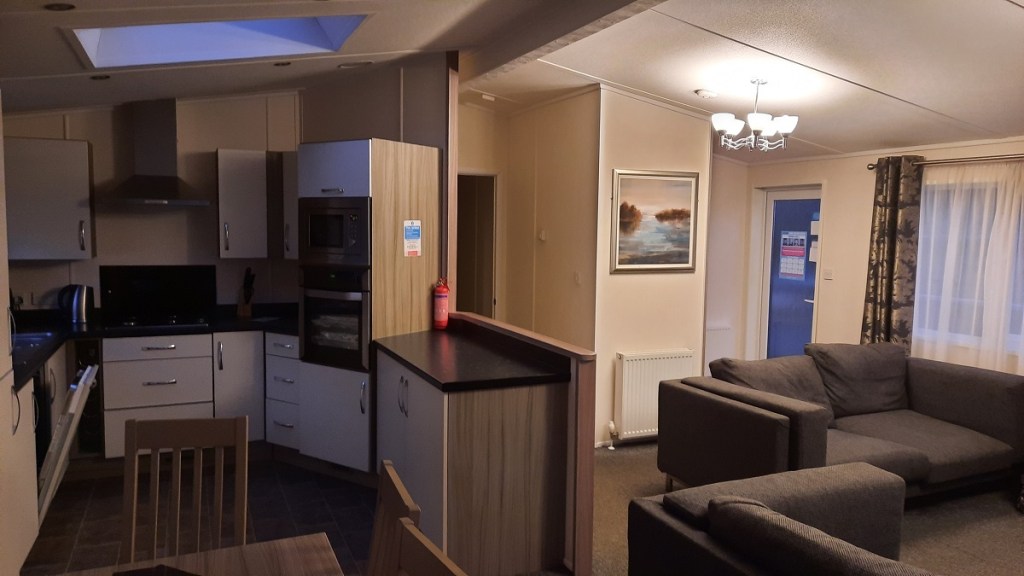 Leaving home at mid-morning on a Monday enabled us to have a fairly easy journey around the M25, M3 and A303 to our lunch stop at Solstice Services, a few miles before Stonehenge. Then the route, after miles of fast dual-carriageway, is then forced into a single carriageway which has not changed since I first travelled it in the 1960s.. But finally, we reached Honiton where the route widens back to dual carriageway, then after a few miles on the M5, we took our exit out to the coast. We arrived at Dawlish train station just minutes before the arrival of the train bringing my grandson up from Falmouth. It was almost dark before we’d collected keys and taken possession of our lodge, First impressions out-did our expectations. I’d been expecting the accommodation to be similar to a large mobile home, but this was much more robustly built. Floors felt solid, and walls were thicker – possibly up to 180mm thick. Windows were domestic uPVC with double glazed units. Fridge, freezer and dishwasher were normal domestic models; as was the gas hob and cooker. Heating and dhw was by combi gas boiler with radiators throughout.. I couldn’t help but wonder what the life expectancy of the lodges will be. Will they depreciate much the same as caravans and mobile homes do? I would hope not, since the initial outlay is in the region of £90K – https://burtonconstableholidaypark.co.uk/product/victory-park-view/