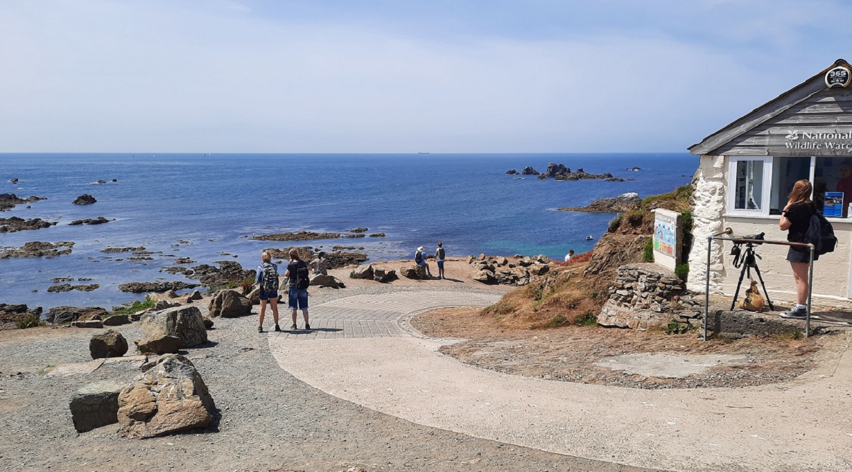 We were each doing our own thing today but our plan was to meet up in Lizard Village at lunchtime. I was ready to leave by 10am so I set off on the 20-mile journey. Although there is a National Trust Carpark closer to the Point, parking is free around the edges of the large village green at Lizard, and since it was not yet 11am, not many cars had arrived. I sent a message to the girls telling them where they could find me parked alongside a couple of picnic benches and then I set off for a look around the village. It wasn’t long before I passed the village bakery where the first batches of Cornish pasties were just being unloaded from the ovens. The aroma drifting into the street was just too much to resist. I was drawn in and bought one– then returned to the picnic benches. What a delicious feast it was! Soon the girls and Sam arrived and we set off to Lizard Point; the family on foot and me on my scooter. The point and lighthouse are just about a mile away along a narrow, surfaced roadway. As you stand at the point, you are standing on the most southerly point in the British Isles. Looking out to sea, the nearest land is the coast of Brittany just about 100 miles away.