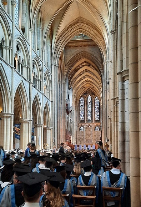 The ceremony began with the Chancellor and Faculty processing up the centre aisle to take their places on the podium. Then the organ began the fanfare introduction to Hubert Parry’s Anthem “I was glad when they said unto me” followed by the voices of the University Choir. What a splendid start to the ceremony! Next followed several speakers and finally, a long procession of students took their turn to be called up to be conferred with their degree. But we, like everyone else in the Cathedral were waiting to see only one person, and that moment finally arrived. What a proud moment it was!