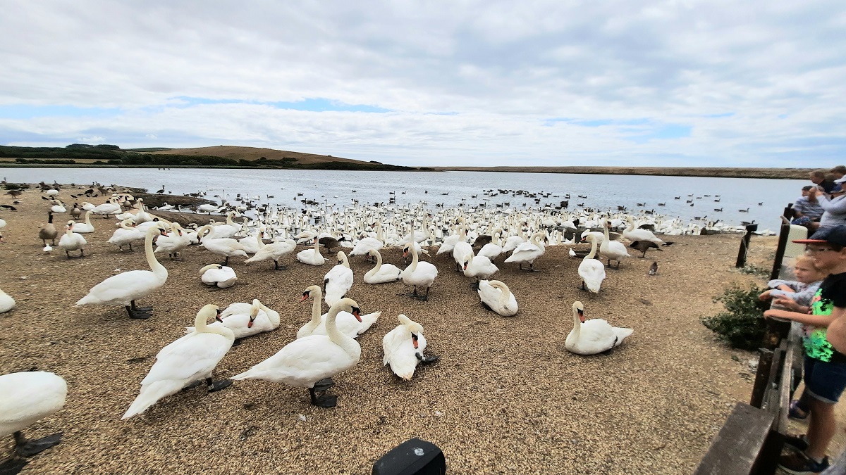 Today was my last before returning home. I had a Tesco voucher to admit me to the Swannery at Abbotsbury. It was a longish drive and the weather wasn’t looking too promising. But finally I decided to go for it, so I set off across country to join the A35 towards Dorchester. The final section of the drive is along the high ground which overlooks Chesil Beach which is an 18-mile long shingle barrier beach stretching from West Bay to Portland. The pebbles along the Beach are graded in size from potato-sized near Portland to pea-sized at Bridport. Then behind the shingle bank, there is a freshwater lagoon, The Council have thoughtfully supplied a number of laybys along the route from which to view the coastline.