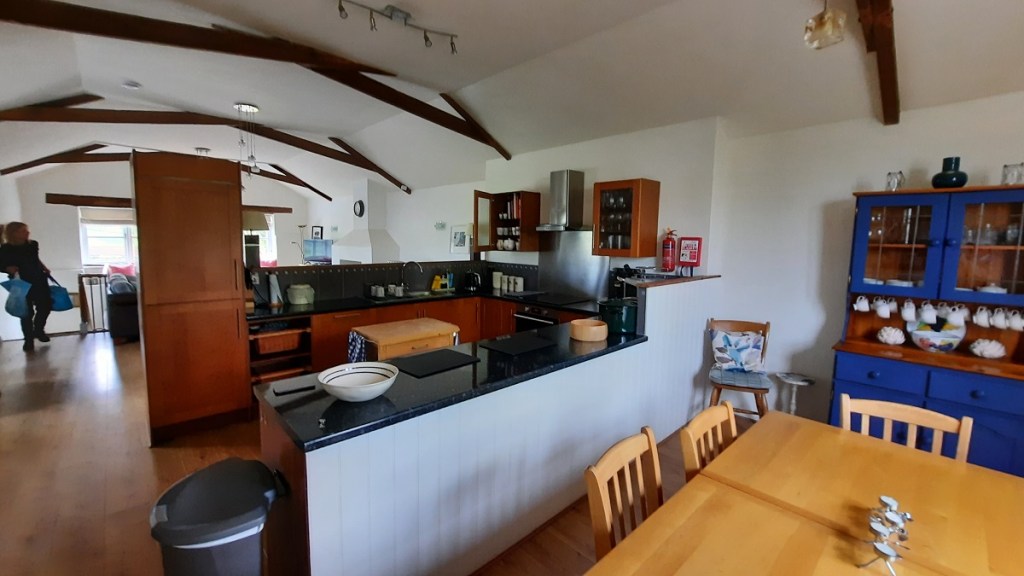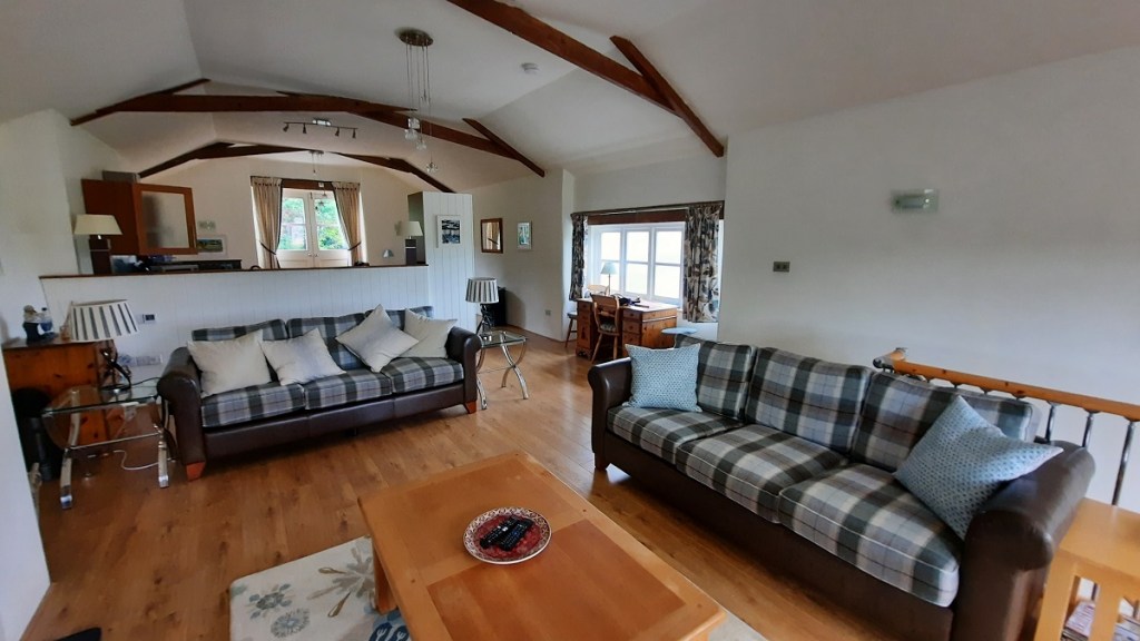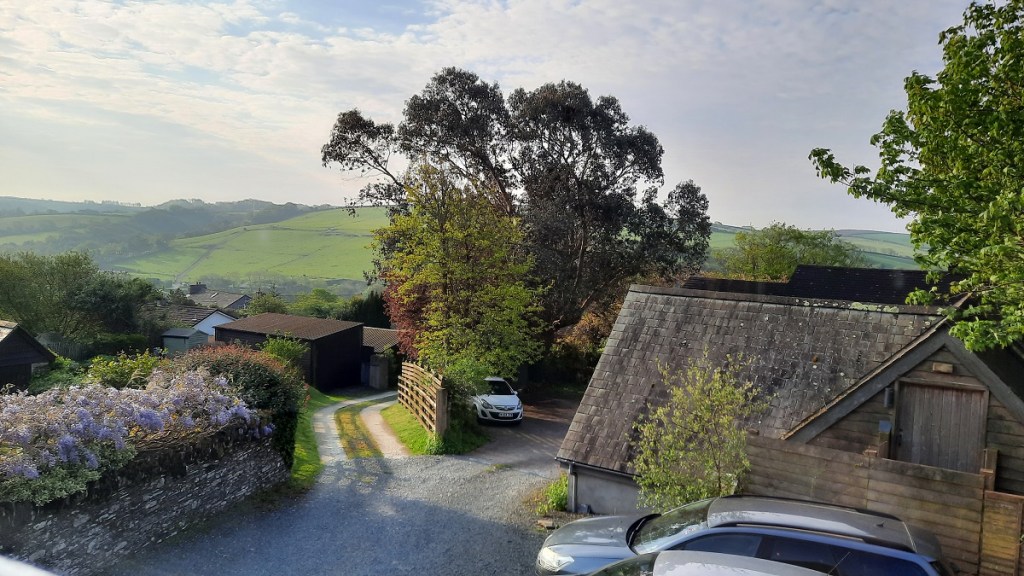 Shortly after our arrival, my second daughter arrived from Sussex and also my grandson from St Andrews in Scotland. Together, we explored our new home for the week. The holiday cottage is actually an unconventional barn conversion – unconventional because all the bathrooms and bedrooms are on the ground floor, with the kitchen, dining area and lounge area all open plan on the upper floor. And with some lovely views across the rolling Devonshire hills, it was a wise choice.