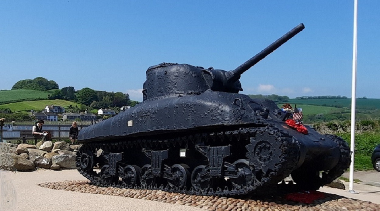 The tank is a memorial to almost 1000 American soldiers killed close by during April of 1944. During the few weeks before D-day, secret rehearsals were taking place along this stretch of the Devon coast. The rehearsal involved both American and British forces of both the army and the navies. Unbeknown to the naval ships, a flotilla of German E-boats based in Cherbourg got curious about the activity and very soon got amongst the US landing craft. Two US landing craft were sunk with a huge loss of life. Several tanks and vehicles still sit on the seabed a few hundred yards from the beach.