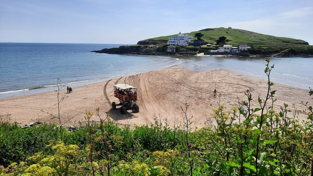 Bigbury Island is around 400 yards from the mainland with about 700 yards of sandy beach between the two low water lines. At high tide, the water is around seven feet deep on the causeway. There are two high tides every 24 hours so should you find yourself marooned because of the rising water, you can always pay to have the sea-tractor ferry you across to the mainland. On the Island is a 13thCentury Inn named The Pilchard, so called because in the 1800s fishermen caught vast numbers of pilchards around the Island, stored them in barrels of salt and sent them to market. After several years the pilchard stocks diminished so that now, pilchards are rarely seen in these waters.