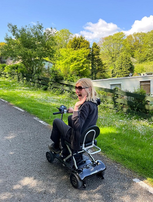 And then I had to face the climb back to the carpark. The scooter coped with the gradient reasonably well over the first sixty or so yards. But as I struggled to clear one of the speed ramps, a car coming down the lane stopped and the driver offered to whisk me back to the carpark. I gladly accepted. Only as I sat looking at the dashboard, did I realize I was in a Tesla. Angela delightedly drove my scooter back up the hill. Judging by Jen’s picture, I rather think it made her day!