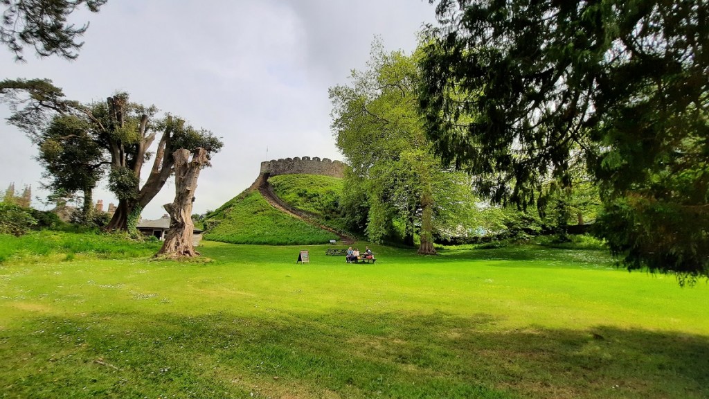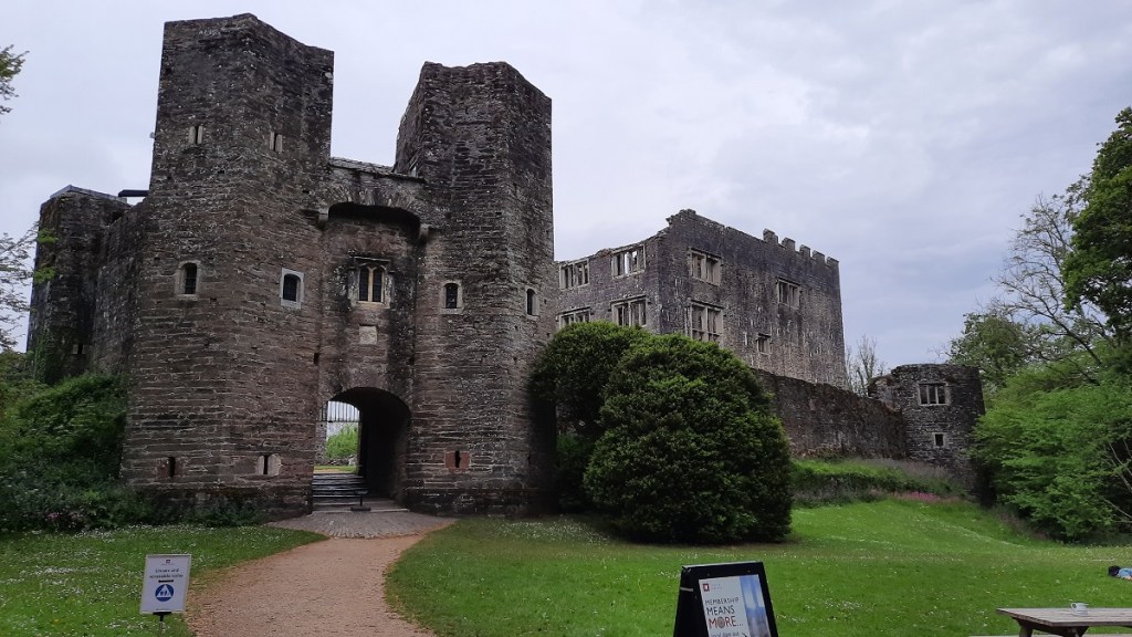 On our first day, we needed to drive to Totnes railway station to meet Sam, my grandson who had travelled up from his university in Cornwall. I’d also planned a visit for myself and two daughters close to Totnes. Their idea of a good day out is to walk in beautiful surroundings; mine is to visit historical buildings. So when we are away together, I endeavour to combine the two. After we’d met up with Sam at Totnes, I drove a few miles to Berry Pomeroy where I wanted to visit the Castle. Also, there just happens to be a listed walk starting from this castle to the castle at Totnes – my next port of call. So before I visited the castle and before the family set off on their walk, we sat out and enjoyed a packed lunch.