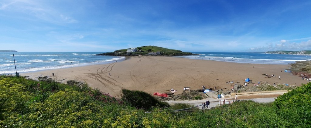 Four years ago, the girls hired a house in Bigbury, whilst I took my caravan to a site just a couple of miles away. We thought it would be nice to revisit. The beach at Bigbury is unique and we decided to spend a day there. It was only a drive of about ten miles – a bit longer if the tide is in because part of the road goes under water at high tide. So it was the long way there and the quicker way back. At the centre of the beach is a causeway which becomes a sandy beach as the tide goes out, with the water’s edge at two sides.
