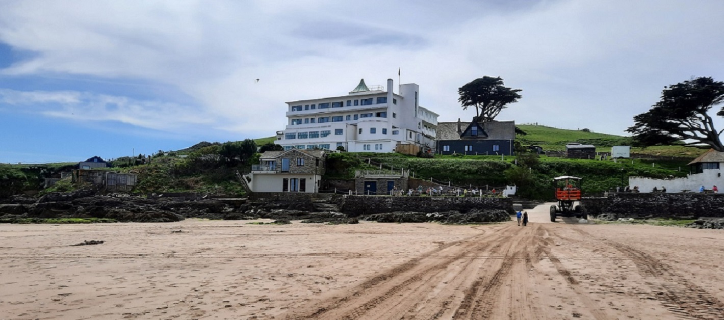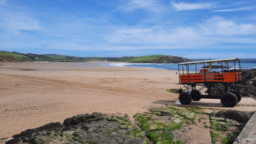 Across the beach is Burgh Island with a hotel, a pub and a couple of cottages. In the early 1900s, the Island was bought by filmmaker Archibald Nettlefold and heir to the Guest, Keen and Nettlefold engineering firm. He built the hotel in the Art Deco style, and it became a popular destination in the 1930s. Novelist Agatha Christie was a frequent guest and used the hotel and Island as the setting of some of her stories. The Beatles are reputed to have stayed when performing in Plymouth, and Edward and Mrs Simpson were frequent visitors. Churchill and Eisenhower spent time here during the late preparations for D-day. It still maintains its exclusivity. During the low season, a room with dinner can be yours for as little as £750 per night! Once the tide comes in, the causeway is covered by several feet of water. Visitors to the Island need to use the sea tractor.