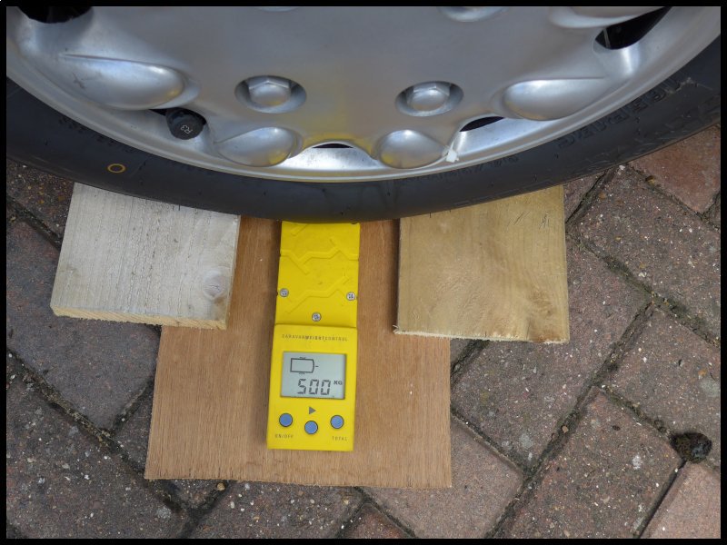 Having weighed the nose weight, the device is used on each wheel in turn until it finally gives the total of the three individual weights. Hopefully, the total weight will be less than the figure stamped on the caravan’s plate.