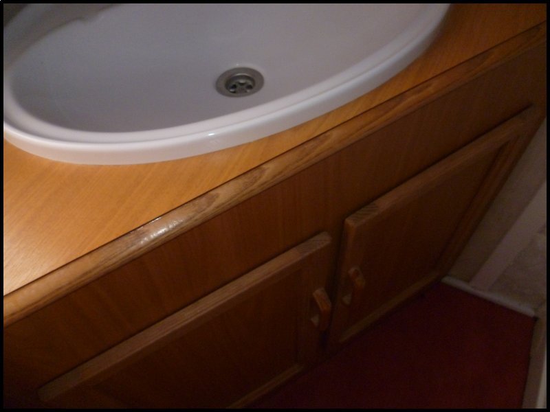 Some of the wooden edging strips where they had been constantly wiped with a damp cloth were looking very tired after 13 years of use. I started by rubbing down the edges with fine wire wool. Don’t use glass paper. It will take off the high spots. Because the wire wool takes up the shape of the moulding, it keeps the rubbed surface even. After dusting off and wiping down with a damp cloth, I left the job till the next day to dry. The edge mouldings were now going to be sprayed, so the worktop was masked off with tape up to the moulding and newspaper was added to protect it from over spray. The underside and doors were also masked. With the masking done, a can of clear lacquer – the type bought in Halfords and used as the topcoat on metallic paintwork – was used.