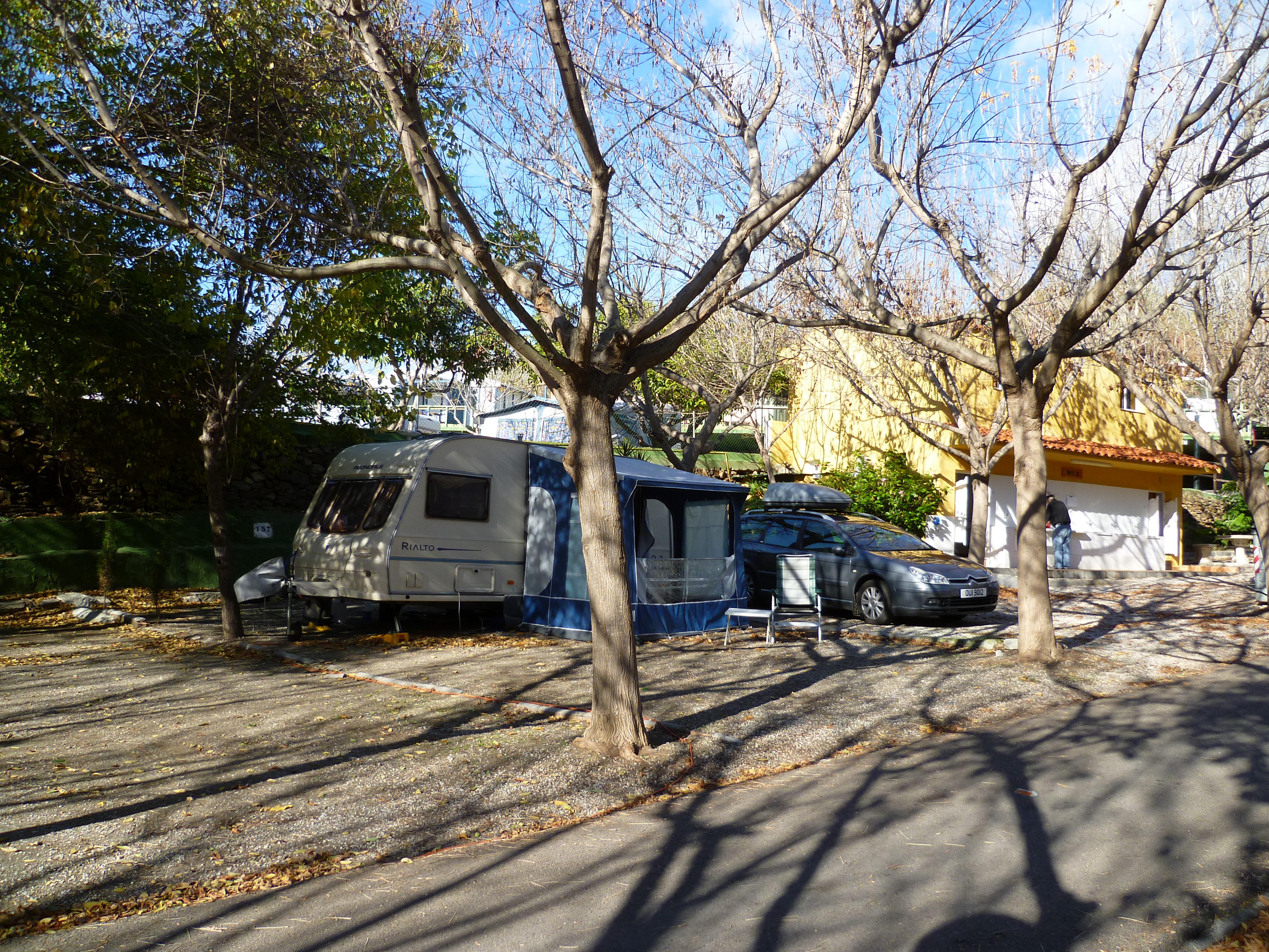 My departure in the morning was delayed because of the frost. The car’s windscreen was thickly coated with ice. It took several minutes before the demister allowed me to scrape the ice. Eventually I was able to make my way up to the motorway junction with the outside reading on the dashboard still showing 0oC. The motorway goes through the city with much of the route being elevated so although there’s always plenty of traffic, its usually free-flowing. Sometimes lane one becomes an exit ramp and as there’s a fairly low speed limit, I keep to the centre lane. Once the road leaves Granada it begins to loose height, quite steeply in places until it meets up with the A7, the motorway which runs for nearly 800 miles from the French border down to Algeceras. To my surprise, the section of motorway which last year looked almost finished, still wasn’t open, so I headed off towards the coast road with it’s towns, traffic lights and hilly bends. Although the distance between Granada and Motril (as the crow flies) is only 26 miles, there’s a difference of around 2500 feet and whereas it was freezing in Granada, 45 minutes later down in Motril, it was 180C. Once I was passed the Heradura roundabout I was able to climb the hill and rejoin the motorway. By 10.30am I was parked outside Camping El Pino. I took a walk around the site looking for a suitable pitch. My late wife and I, over the years have used many pitches on this site and one of them quite close to one of the toilet blocks, was free. I went back to reception to book in and having paid for the first 30 days, brought in the outfit and began to set up. The pitch chosen was a big one. Not only is it wide enough to park across the pitch, but when the awning is erected, there is still enough room to park the car and sit out. Behind the van is space to fix a clothes line.