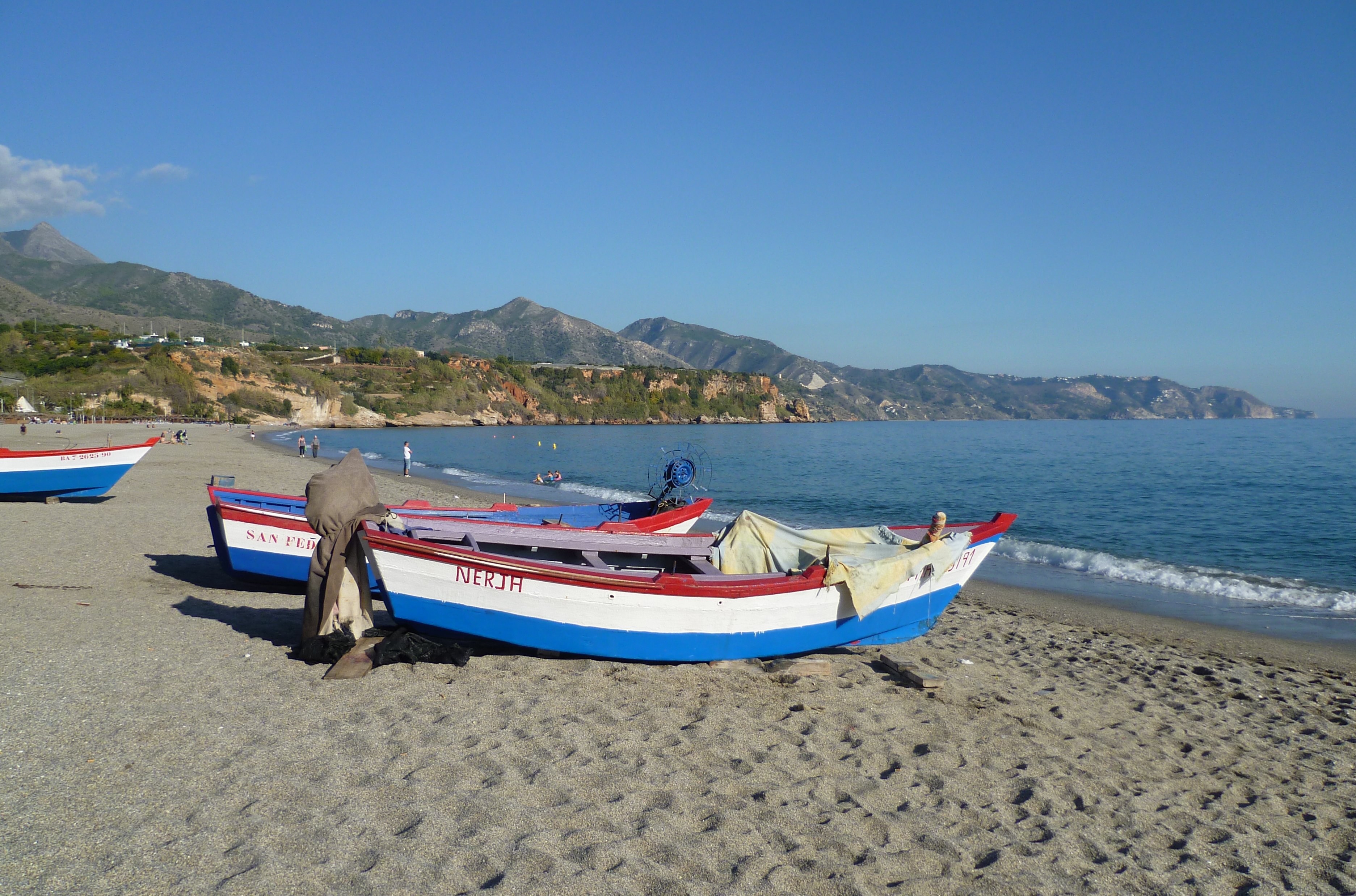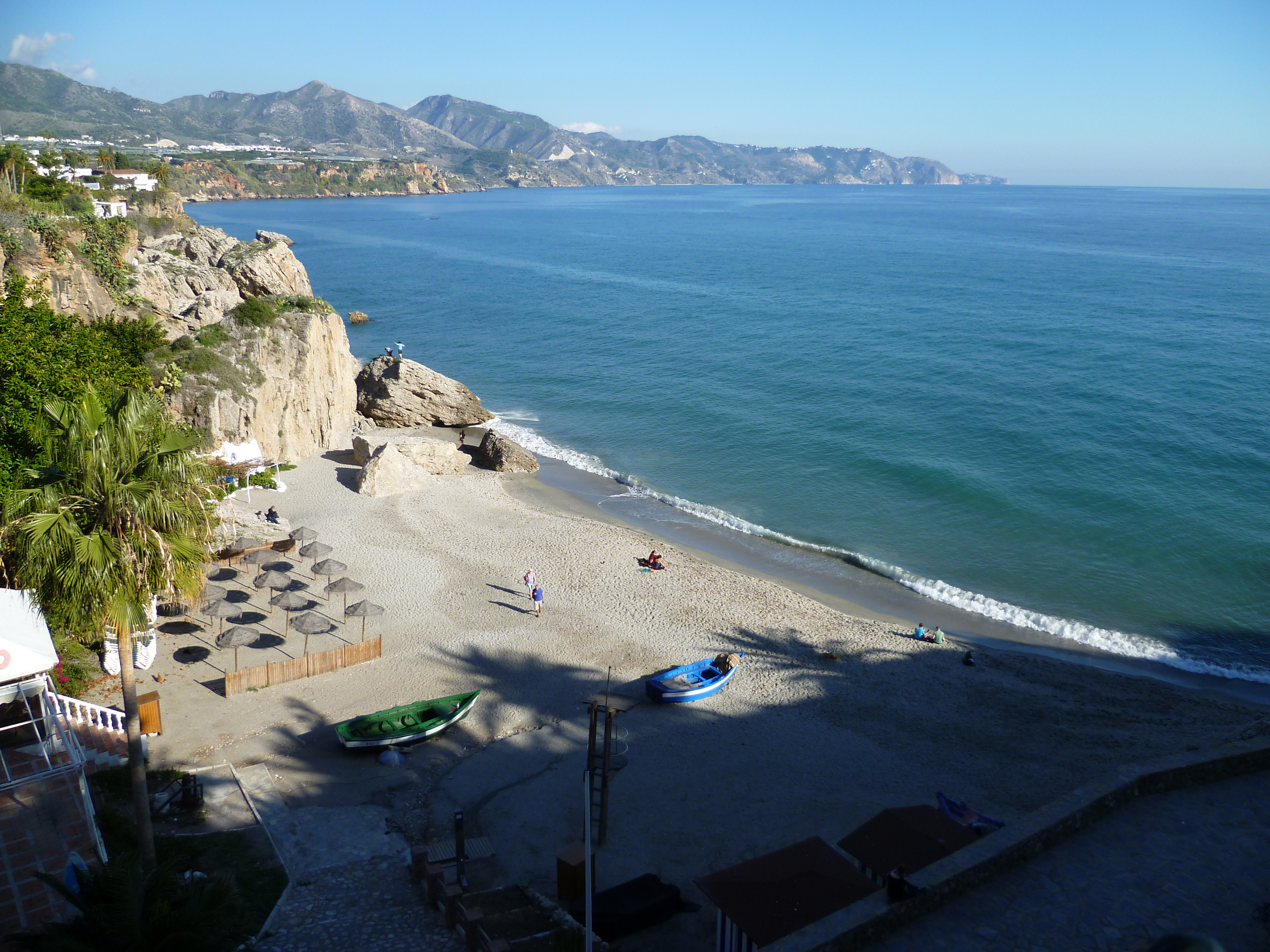 An exciting day today. I drove to Malaga airport to collect the family. Two daughters and grandson have booked an apartment just along the road so they’ll be staying for the next eight days. The camp site is forty miles from the airport but once I’d done the first mile up on to the A7 and with the airport having its own slip road from the motorway, it became an easy drive. Their plane was on time and forty minutes after landing they appeared. Fortunately parking wardens at Malaga Airport are some what more tolerant than those we normally meet in the UK. Back at Torrox, I deposited them at the apartment and after admiring the view from their balcony, left them to unpack. We met up later and drove into Nerja for dinner.