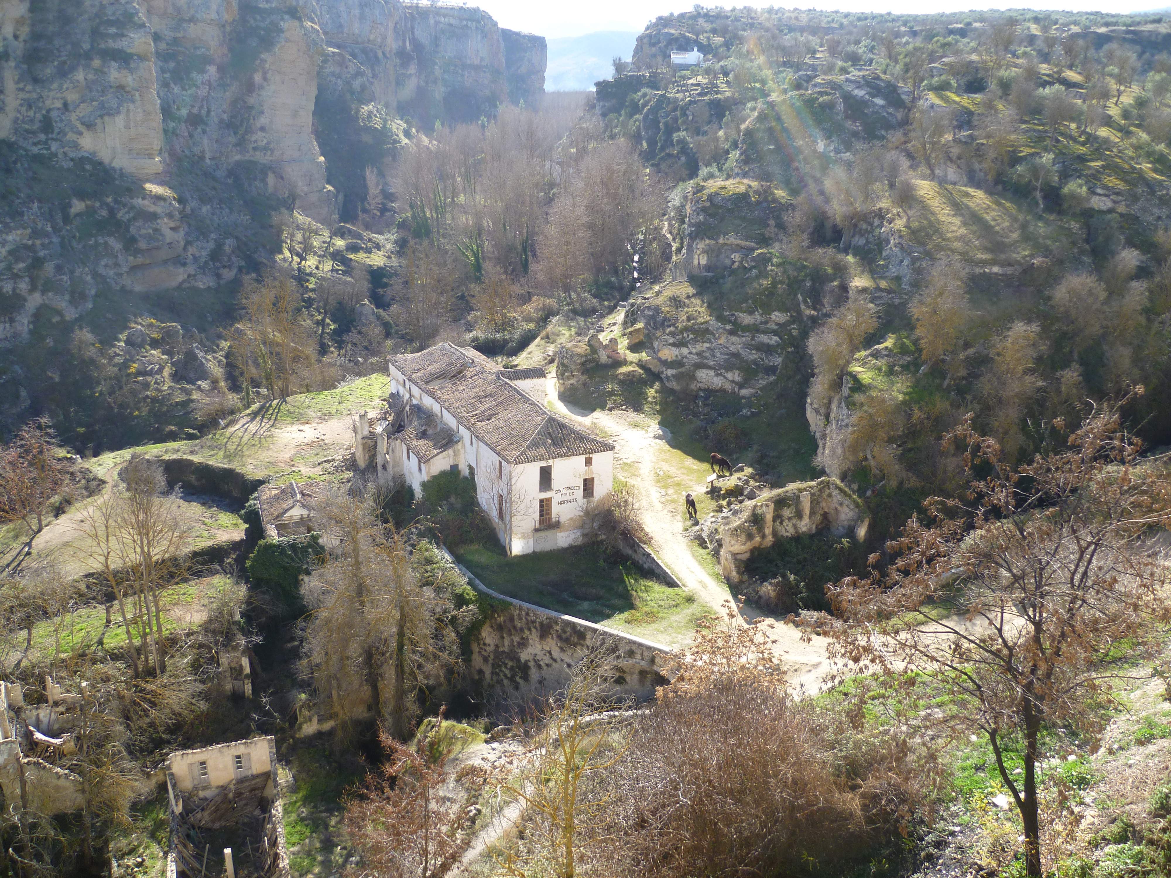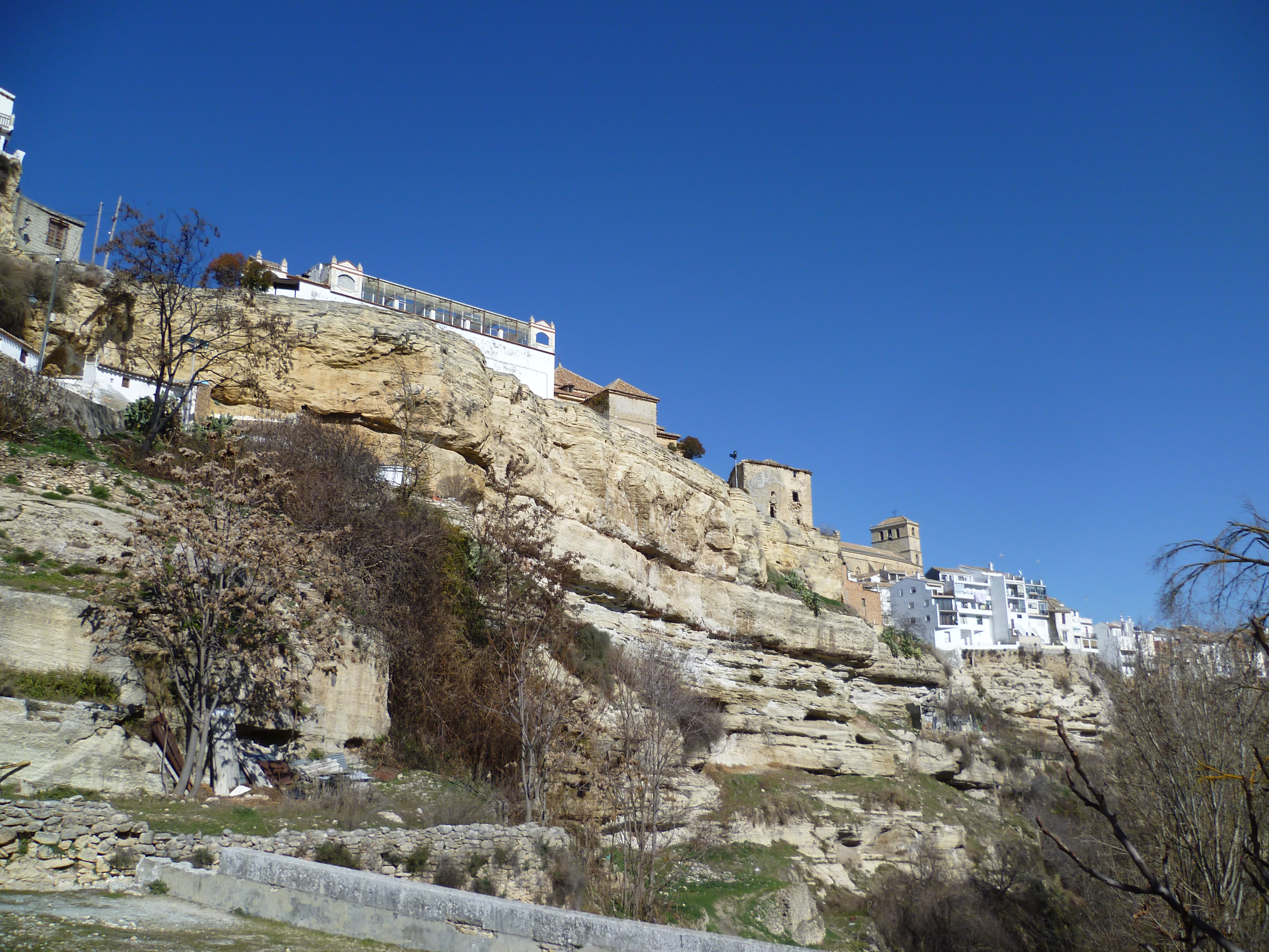 In the UK its Boxing Day – in Spain it’s just another working day. All the shops are open and it’s business as usual. After packing up some lunch we set off on the forty mile drive to Alhama de Granada. The first part of the drive is along the A7 to Velez Malaga where we turned inland along the valley for several miles. After a few miles the road climbs up the hillside before reaching Lake Viñuela, which is a man-made reservoir. The road then drops down into the next valley where a few hundred yards from the main road is the village of Viñuela. The road begins to climb again and for the next 9 miles it twists and turns ever higher before reaching a small town. Through the town, the road turns to the right and there in front of you is a surprise. Instead of being mountain roads the road runs level and straight for several miles with agriculture taking place on both sides of the road. Eventually the plain ends and the road begins its twisting and turning climb again. At the top there’s a view across several miles of landscape to the snowy peaks of the Sierra Nevada. The road goes downhill for a short distance before reaching Alhama – a town built on the edge of a ravine. Parts of it were built during the times of the Arab occupation.