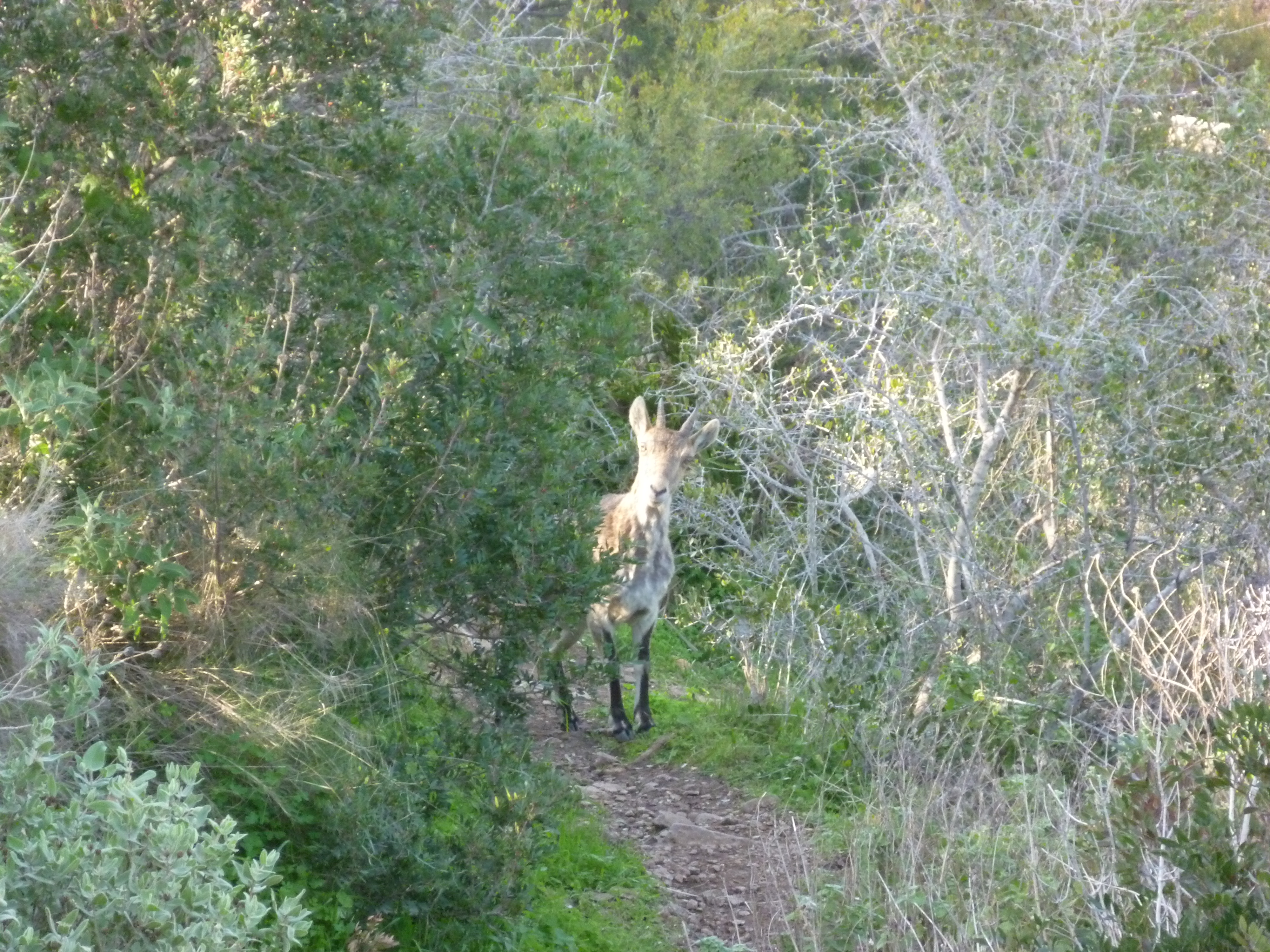 After a long drive yesterday we decided on a short one for Sunday. We drove to Heradurra, taking a packed lunch with us. The beach here runs along the back of the bay, sheltered by high promontories on both sides. I was able to drive the car right onto the beach where we set up our sun loungers in front of the car. To our right, high up on the hill top we could see the remains of the medieval watch tower, one of dozens built along this coast line where watchers could give warning of raiders coming from north Africa to pillage and plunder and seize prisoners to sell in the slave markets. To reach the watch tower was our aim for the afternoon. But first we drove a few miles along the N340 before turning onto the old original road which runs around the headland. We parked at the roadside and continued up a track to the tower. On the way we met an Ibex. I don’t know who was the most surprised. Arriving at the top there were views in both directions.