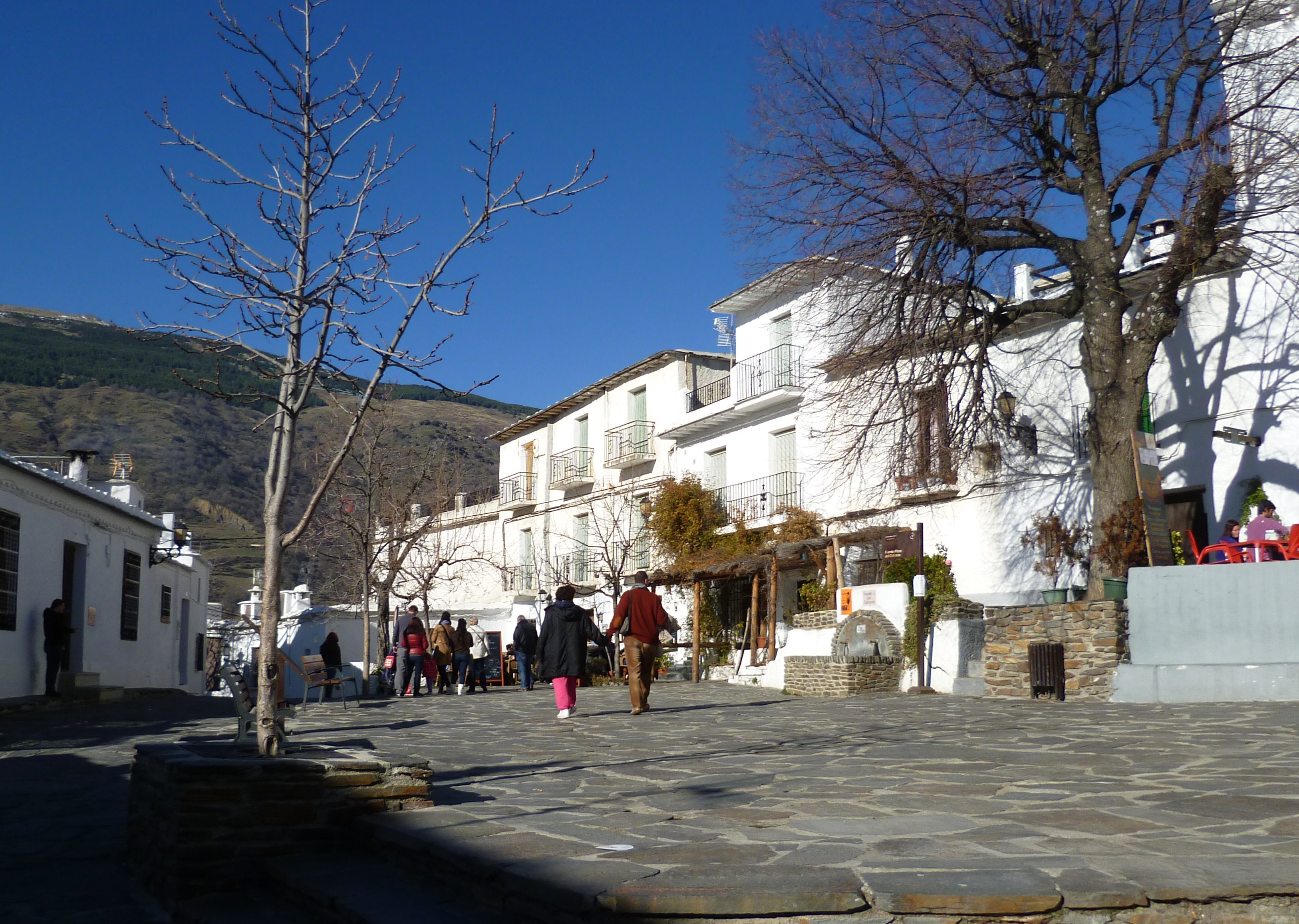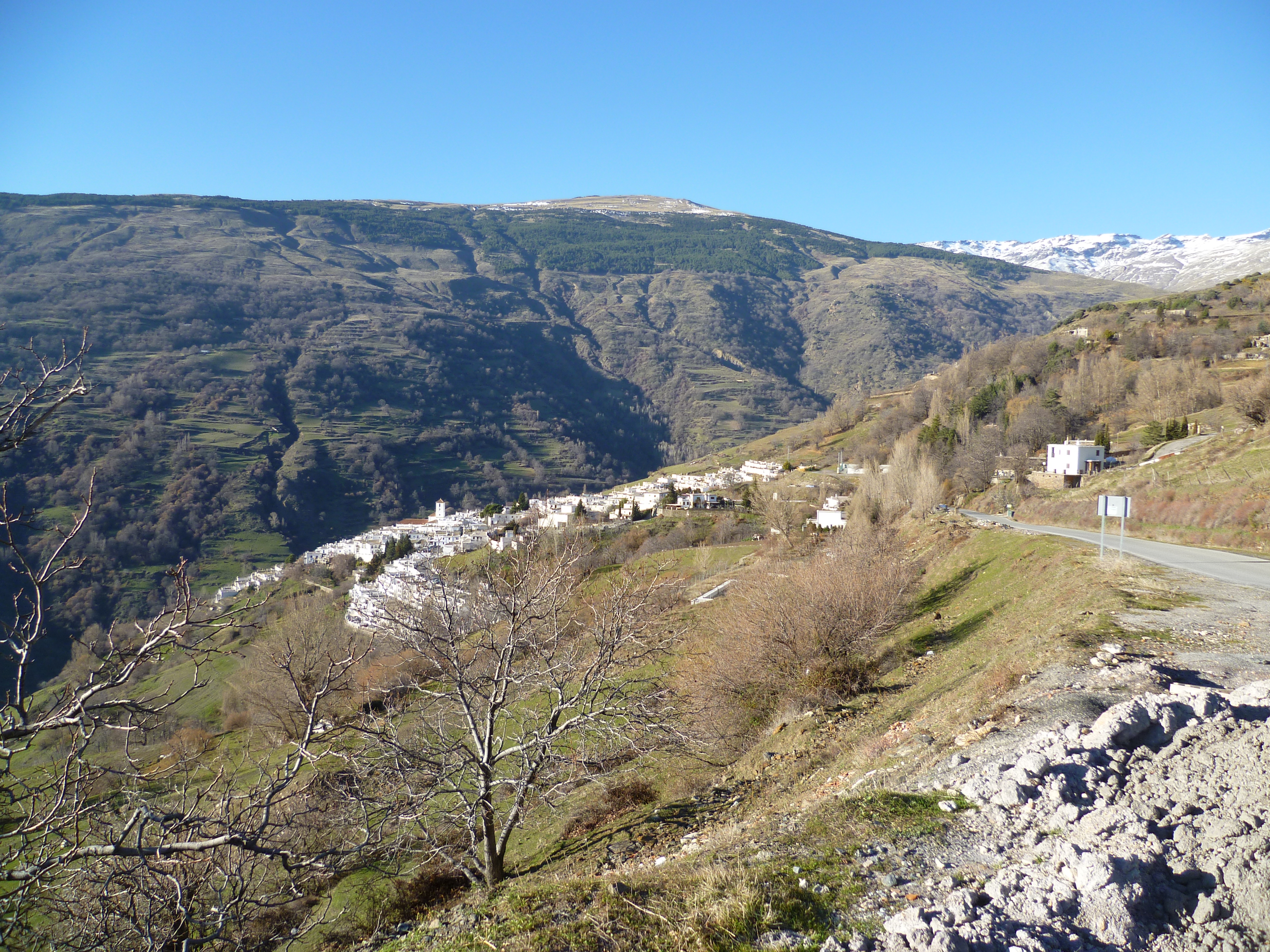 We drove on and as we reached 3500 feet we arrived at Pampaneira. We didn’t stop but drove straight on through the village. The road continued to rise in a series of straight sections ending in hairpin bends. Finally we reached Capileira and my dashboard indicated that we were at almost 5000 feet. We found a parking spot and got out with our cameras to explore. My word, it was cold! But sunny and bright.