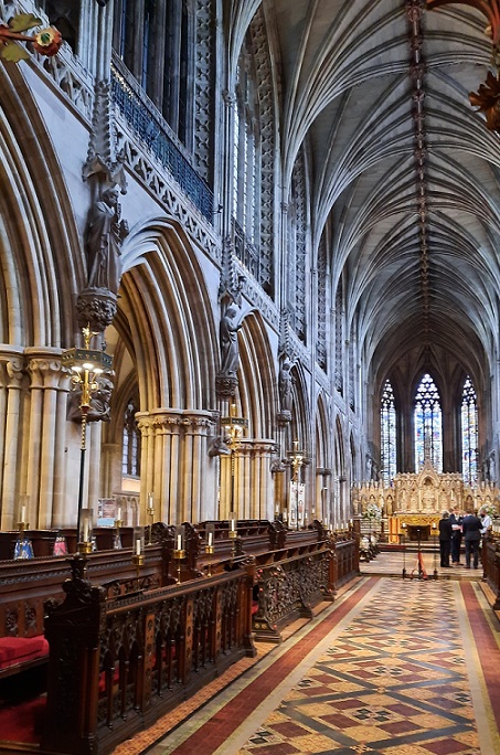 The Cathedral was open to visitors with directions to follow the one-way system. Cathedrals have stood on this spot since 700AD but the present building dates from the 13th Century. Because the precincts were built within a strong surrounding wall, in the 1600s it became a defensive position, first by the Royalist army, then by the Roundheads, and yet again by the Royalists, followed by the final capture by the Roundheads. Consequently, much damage was done to the Cathedral and the nearby properties.