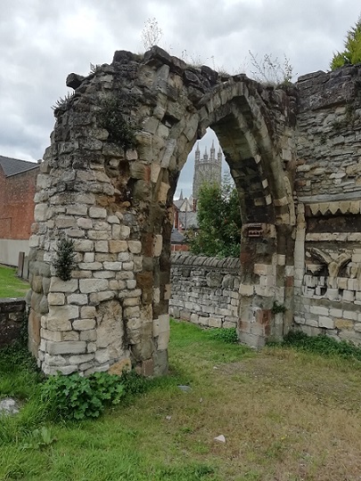 From the Cathedral it wasn’t far to the remains of St. Oswald’s Priory. Around the year 900, the Priory was founded by Lady Aethelflaed, a daughter of Alfred the Great. The Priory Church, initially dedicated to St. Peter, was constructed from recycled Roman stones from the town. Ten years later the remains of Saint Oswald were taken there and the building rededicated to the saint. In the centuries that followed St Oswald’s grew rich as a place of pilgrimage. But after the Norman Conquest the new Abbey of Saint Peter was built close by and as the new Abbey became more successful, St. Oswald’s fell into ruin. Saint Peter’s Abbey continued to flourish right up to the dissolution when only the church was left, which is now the Cathedral.