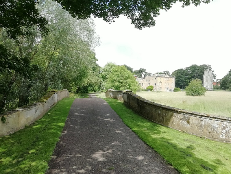 The boundary of the grounds is marked by the river, now little more than a ditch, but in times past, the river was once navigable. In one corner of the park are the remains of a 14th Century four arched bridge.
